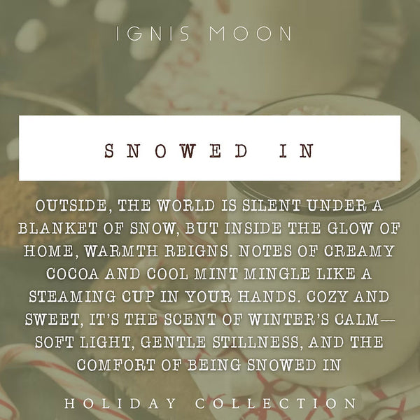 Snowed In is the ultimate winter indulgence—rich, creamy cocoa swirled with a touch of cool mint, like sipping a comforting drink while wrapped in a blanket during a blizzard. This fragrance captures the magic of being tucked away from the storm, cozy and content, with sweetness, warmth, and just a hint of frosty freshness.