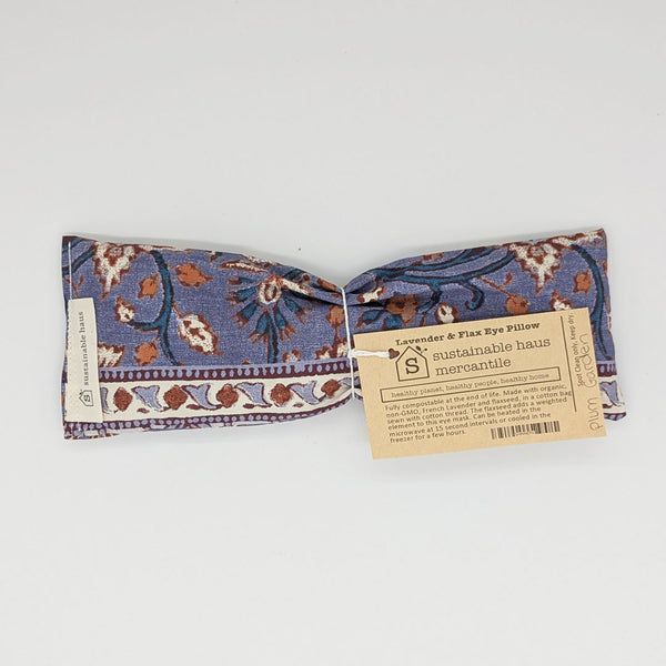Flax eye pillow with floral pattern and 'Sustainable haus mercantile' tag on a white background