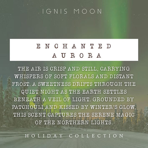 Crisp winter air and ozone notes meet a touch of sweetness for a fresh beginning, while delicate florals add a dreamy elegance. The base of patchouli and vanilla grounds the fragrance in warmth and mystery, like standing beneath the dancing northern lights on a frosty night.