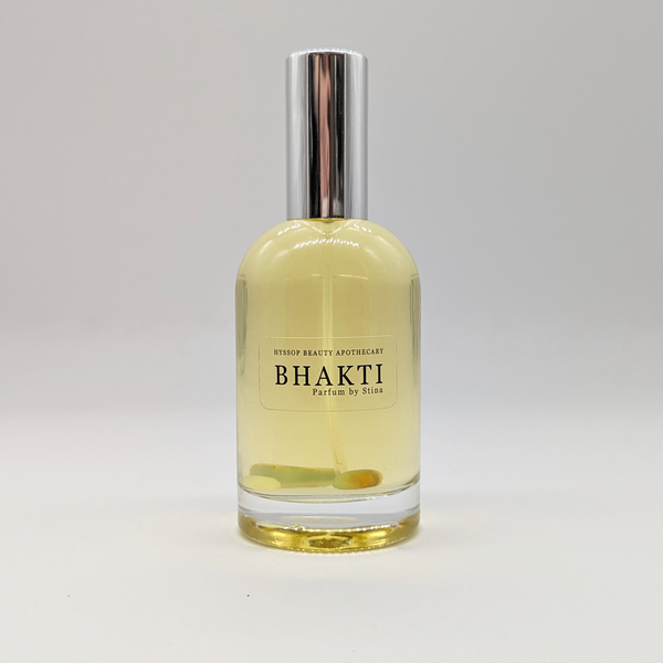 Bhakti in Sanskrit means "devotion." This scent is bohemian, floral, and earthy. Reiki-charged amazonite crystals are added to each bottle.